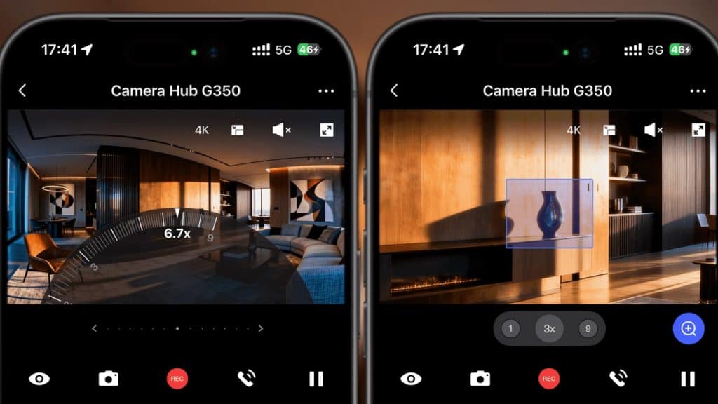 On the camera side, the G350 combines a 4K wide-angle lens (3840×2160, 133° field of view) with a 2.5K telephoto lens (2560×1440, 43° field of view), enabling up to 9x hybrid zoom in recordings. A motorized pan-tilt mechanism provides 360° coverage, supports up to 30 preset positions, and enables AI-powered automatic tracking of people and pets – including automatic zoom for close-ups. For night recording, Aqara relies on integrated infrared illumination at 940 nm and a large f/1.6 aperture, which is intended to deliver sharp images even in low light.