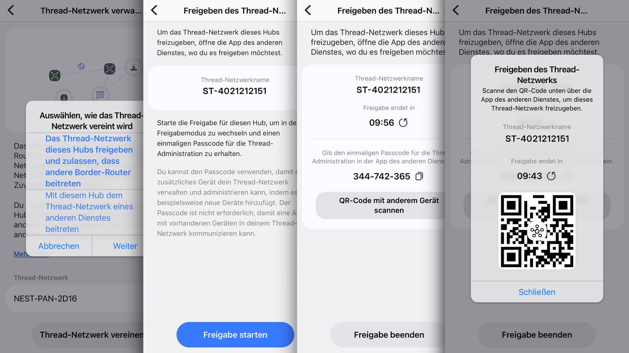 Nach Auswahl der ersten Option („Das Thread-Netzwerk dieses Hubs freigeben …“) öffnet sich ein Bildschirm mit dem aktuellen Netzwerknamen. Darunter: der Button zur Freigabe. Er erzeugt einen einmaligen Passcode, bestehend aus neun Ziffern, die für zehn Minuten oder bis zum Beenden der Freigabe gültig sind. Alternativ lässt sich auch ein QR-Code erzeugen, der mit der Smartphone-App eines anderen Ökosystems mit Border Router abscannen lässt. Voraussetzung: Das Zielsystem unterstützt dieses Verfahren zur Freigabe ebenfalls. Aktuell ist das beispielsweise bei Ikea und dem Dirigera-Hub der Fall.