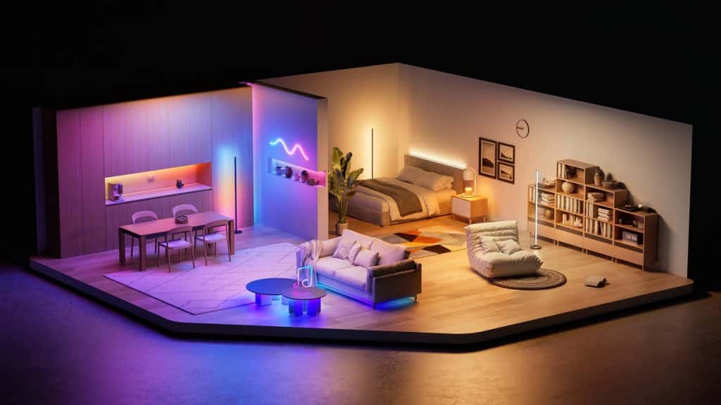 Zwei Bodenleuchten, drei LED-Streifen und eine spezielle Tischlampe umfasst das Sortiment. Entsprechend ihren Fähigkeiten lassen sich die Produkte in drei Gruppen einordnen: