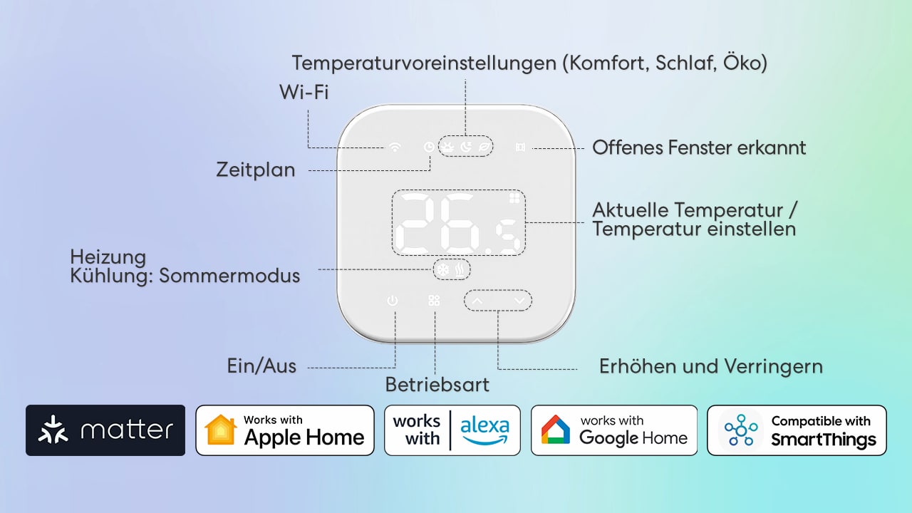 Der Unterputz-Thermostat ersetzt einen vorhandenen Wandregler und steuert Gasthermen oder eine Warmwasser-Fußbodenheizung, sofern diese mit 230 Volt angesprochen werden können. Zur Verbindung mit Matter-Plattformen wie Amazon Alexa, Google Home oder SmartThings dient das heimische WLAN (Matter over Wi-Fi) im 2,4-Gigaherz-Band. 5 GHz werden nicht unterstützt.