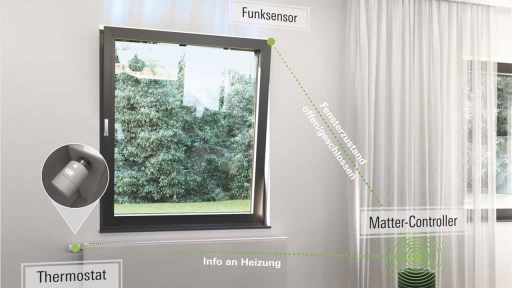 Den klassischen Tür-/Fensterkontakten hat der Funksensor eine lokale Alarmfunktion voraus: Der integrierte Beschleunigungssensor erkennt Erschütterungen beim Einbruchsversuch und löst einen Signalton aus, vollkommen unabhängig vom verbundenen Smarthome-System. Über einen vorhandenen Matter Controller mit Thread Border Router sind weitergehende Automationen wie die Heizungsunterbrechung beim Lüften möglich.