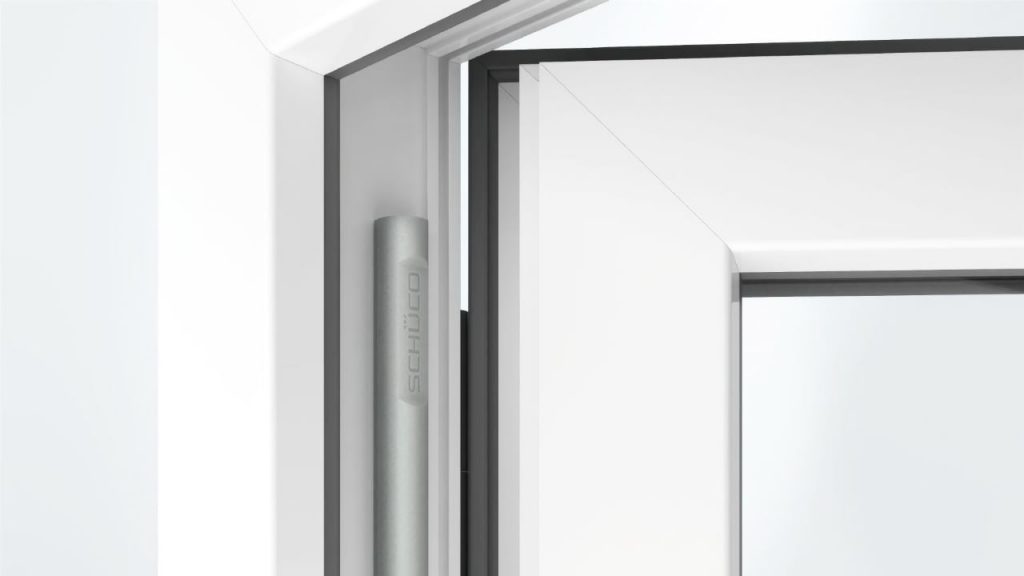 Der Schüco Funksensor (link) ist zum verdeckten Einbau gedacht. Er kann in allen Schüco-Fenstern mit einem VarioTec-Advanced-Beschlag installiert werden sowie in Haustüren des Herstellers, die über einen Schaltkontakt verfügen. Alternativ kommen auch andere gängige Rahmenprofile mit Euro-Beschlag infrage. Der Abstand zwischen Blendrahmen und Flügelrahmen muss allerdings groß genug sein, um den stabförmigen Sensor aufzunehmen.