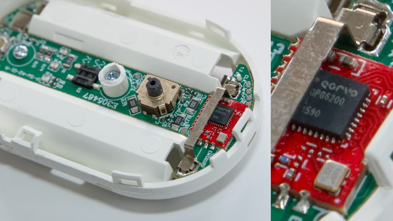Der Blick ins Gehäuse zeigt, warum. Dort verrichtet ein Funkchip des US-Herstellers Qorvo (link) seinen Dienst. Der Multi-Protokoll-SoC mit der Bezeichnung QPG6200L unterstützt mehrere Funktionen, die Qorvo unter der Bezeichnung ConcurrentConnect zusammenfasst. Eine davon ist der Multi-Radio-Betrieb: Qorvos Chip kann kontinuierlich nach eingehenden Datenpaketen scannen – über Bluetooth Low Energy (BLE) und auch auf Protokollen, die auf dem IEEE-Standard 802.15.4 basieren (Thread, Zigbee).